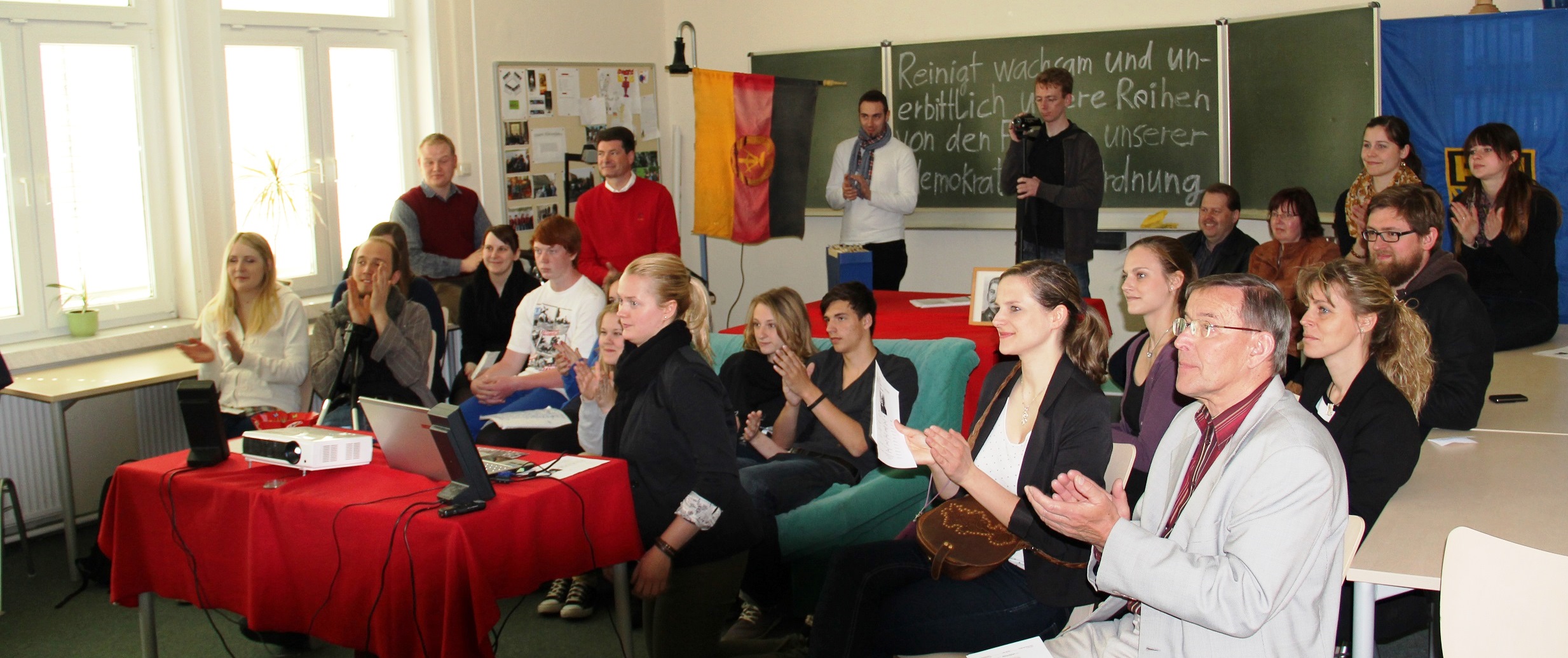 In fünf Gruppen wurden also an fünf Texten Erzählperspektiven, Motivketten und auch Stilblüten genauer betrachtet. Die größte Aufmerksamkeit galt in jedem Fall den Geschichten und den Figuren, die sie bevölkern. Die Schüler gaben sich viel Mühe, eine geeignete Form zu finden, um ihre Beobachtungen für das Publikum sichtbar zu machen. An Ideen dazu fehlte es nicht: Vom Hörspiel über Kurzfilm bis zu szenischem Spiel mit Schattenwandlesung war alles vertreten. Es wurden Figurenreden geschrieben und eingesprochen, Szenen entworfen und Drehorte gesucht. Die Schüler waren erfinderisch: Sie verwandelten den Reriker Strand in eine spanische Sommer-Idylle. Aus dem blitzblanken Speisesaal wurde eine staubige Aula mit Stalinbild. Eine Gruppe zeigte Uwe Johnson beim Schreiben und erfand Leser, die ihm dabei über die Schulter sahen, eine andere verlegte die Handlung der Geschichte aus den dreißiger Jahren in die Jetztzeit. Zwei Tage arbeiteten Schüler und Studenten intensiv zusammen und lernten dabei voneinander. Ein gemeinsamer Grillabend rundete das Programm ab. Bei der Gelegenheit konnten Eindrücke und Erfahrungen abseits des Klassenzimmers besprochen werden, und es war nicht nur von Johnson die Rede. Auch über die Vorteile von Schulen auf dem Lande tauschte man sich aus.